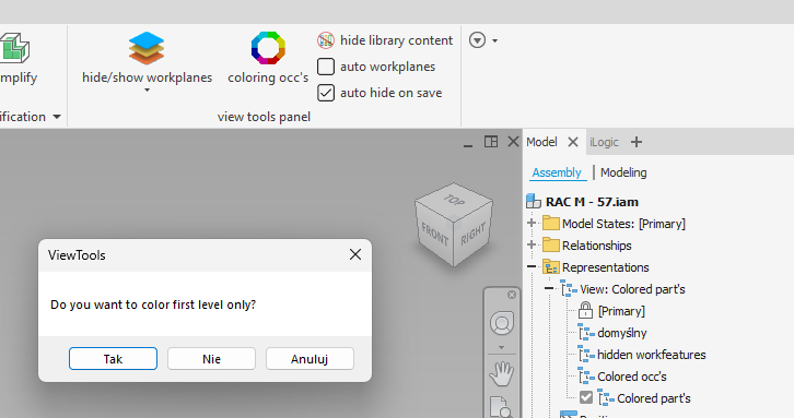 Colors randomly your assembly occurrences or parts with one click, all part occurrences are colored with the same color. Which means you can use it to inspect your assembly.