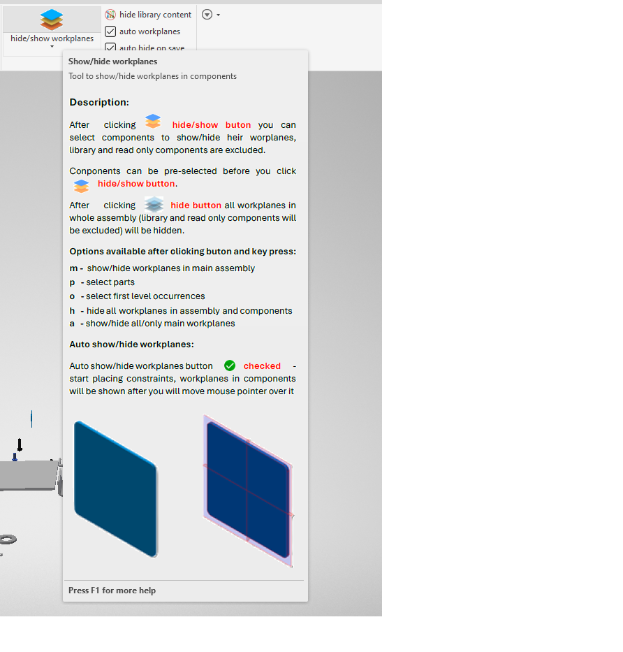 After clicking the hide/show button assembly you can select components to show/hide their work planes, library components are excluded when you are not in the library project.