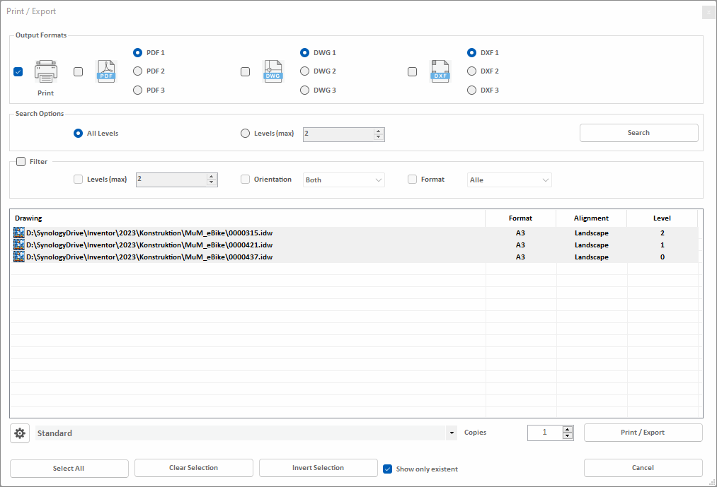 Print all the drawings belonging to an assembly (IAM) without having to open each file individually. You can easily choose which files you want to print like and, thanks to predefined print templates, these are output in the correct format as desired.