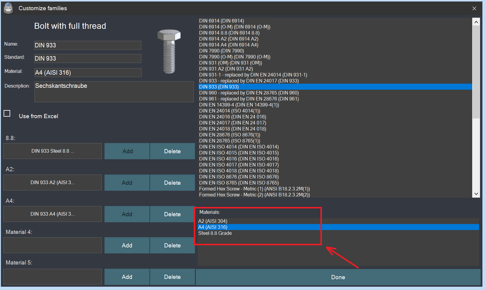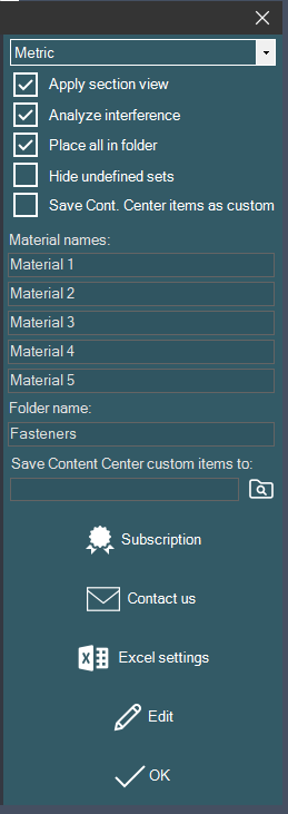 Fasteners can be sourced from the user's custom library or Content Center. Supports 5 material types for each fastener.
