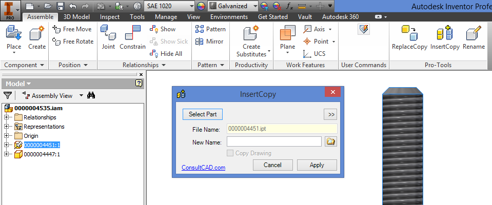 This addin allows you to Insert identical copies (with other filename) directly in an Assembly