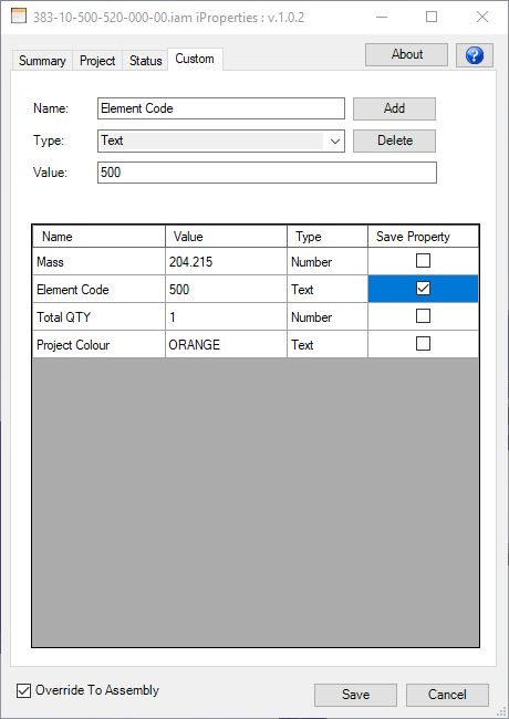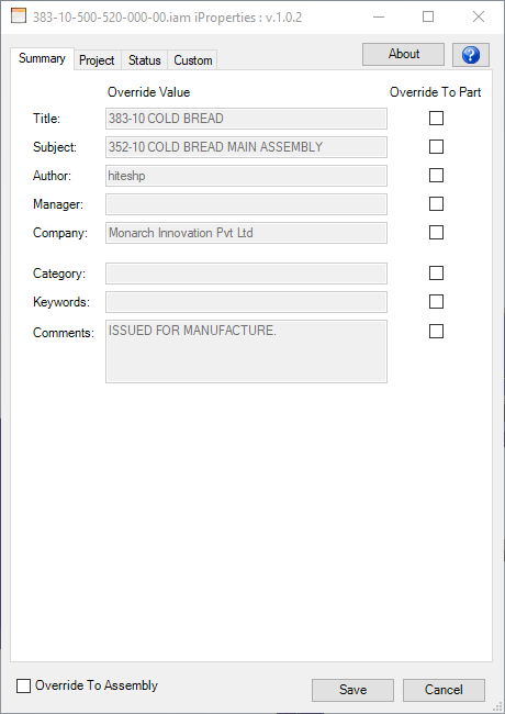 Users can add the properties needed. User also have option to feed the properties to the opened assembly only or to override to its sub-parts. Users can also add custom properties.