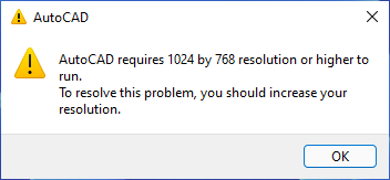 This dialog box by AutoCAD or Autodesk Desktop App will also be closed: AutoCAD requires 1024 by 768 resolution or higher to run. To resolve this problem, you should increase your resolution.
