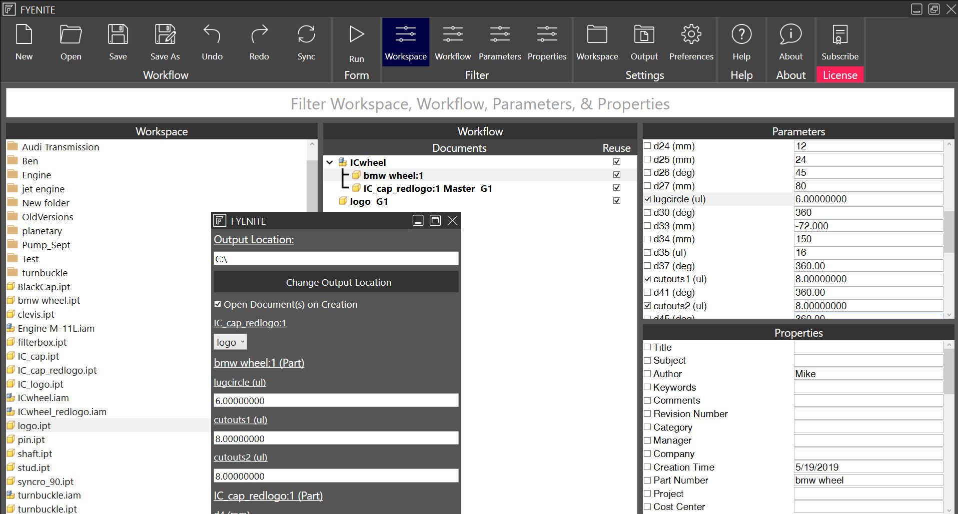 FYENITE allows users to build both saveable and shareable workflows that execute automation tasks by dragging and dropping files and configuring them accordingly. Furthermore, a GUI is automatically generated for the workflow for ease of collaboration and repeatability. For example, a user can drag several parts into their workflow, modify several parameters in each part, run the workflow, and Autodesk® Inventor® processes all the files per the user's inputs - this same workflow can be executed again with different parameter values. Another example, say a user needed to make the same change to the title block of 100 drawings, FYENITE would allow the user to drag these drawings into their workflow, link their properties together such that only one input needs to be entered, and run the workflow, having Inventor process the files accordingly. Additionally, users could export the outputs described above to several formats within the same workflow.