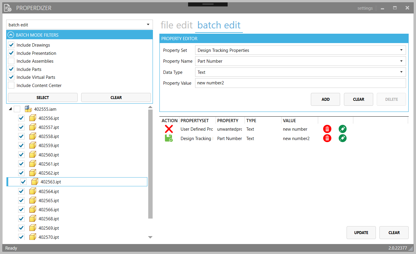 Switch to batch mode, pick the files that you want to edit and then set your standard and custom iproperties for all the selected files in one operation. You can also remove user-defined properties from all files.