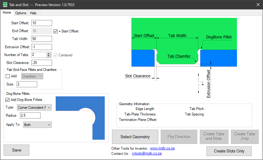 Any uniformly thick parts can be used to create tabs and slots. Further to that, "center drilled", "coincident", "Tangent" or "dog-bone" recess fillets can be added automatically to the Tabs or Slots or both.
