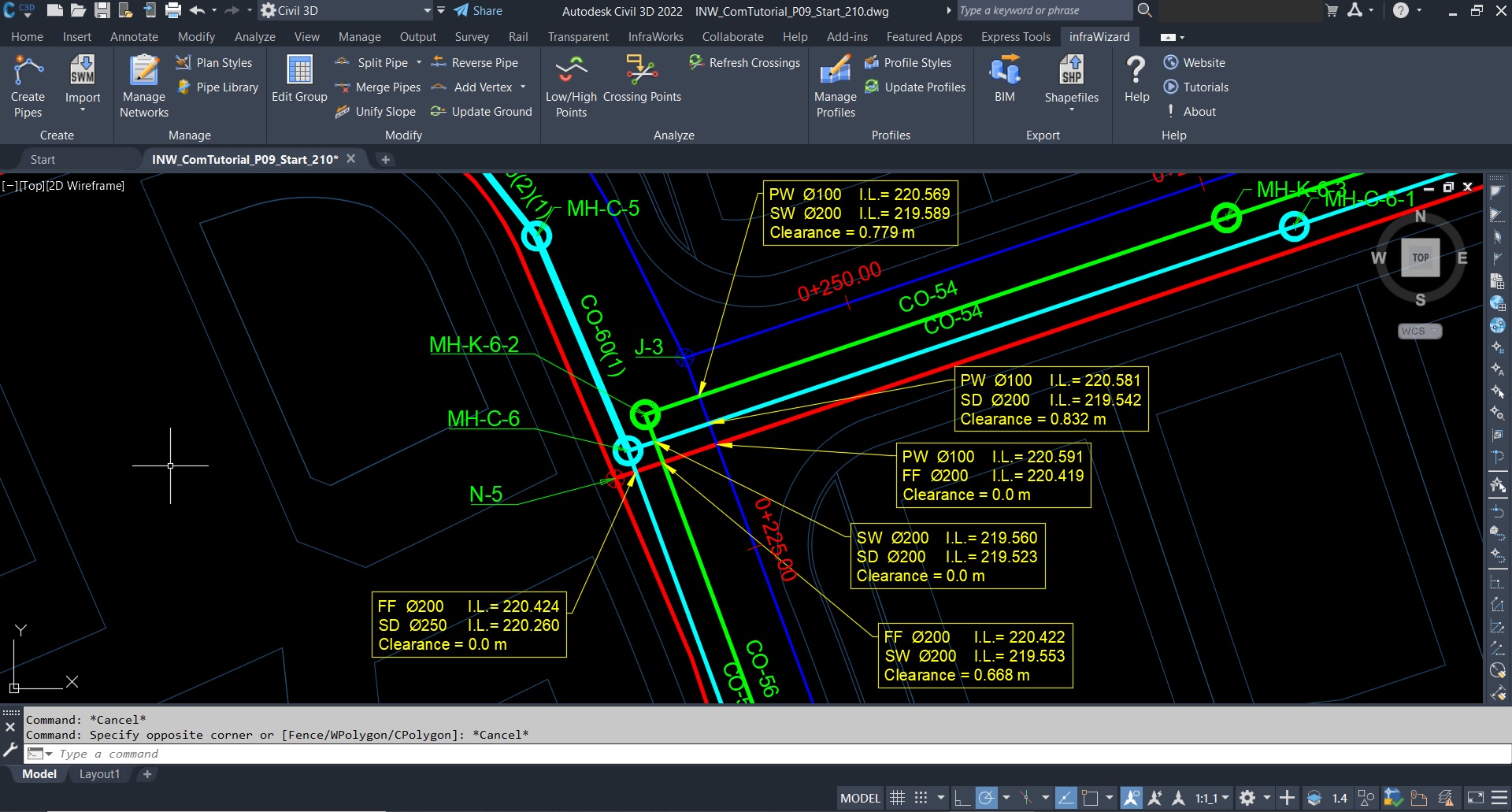 - Get instant crossing points to check between pipes and see crossing annotations on the plan indicating vertical clearance. You can control which crossing annotations to display by selecting network combinations and defining the critical clearance value.