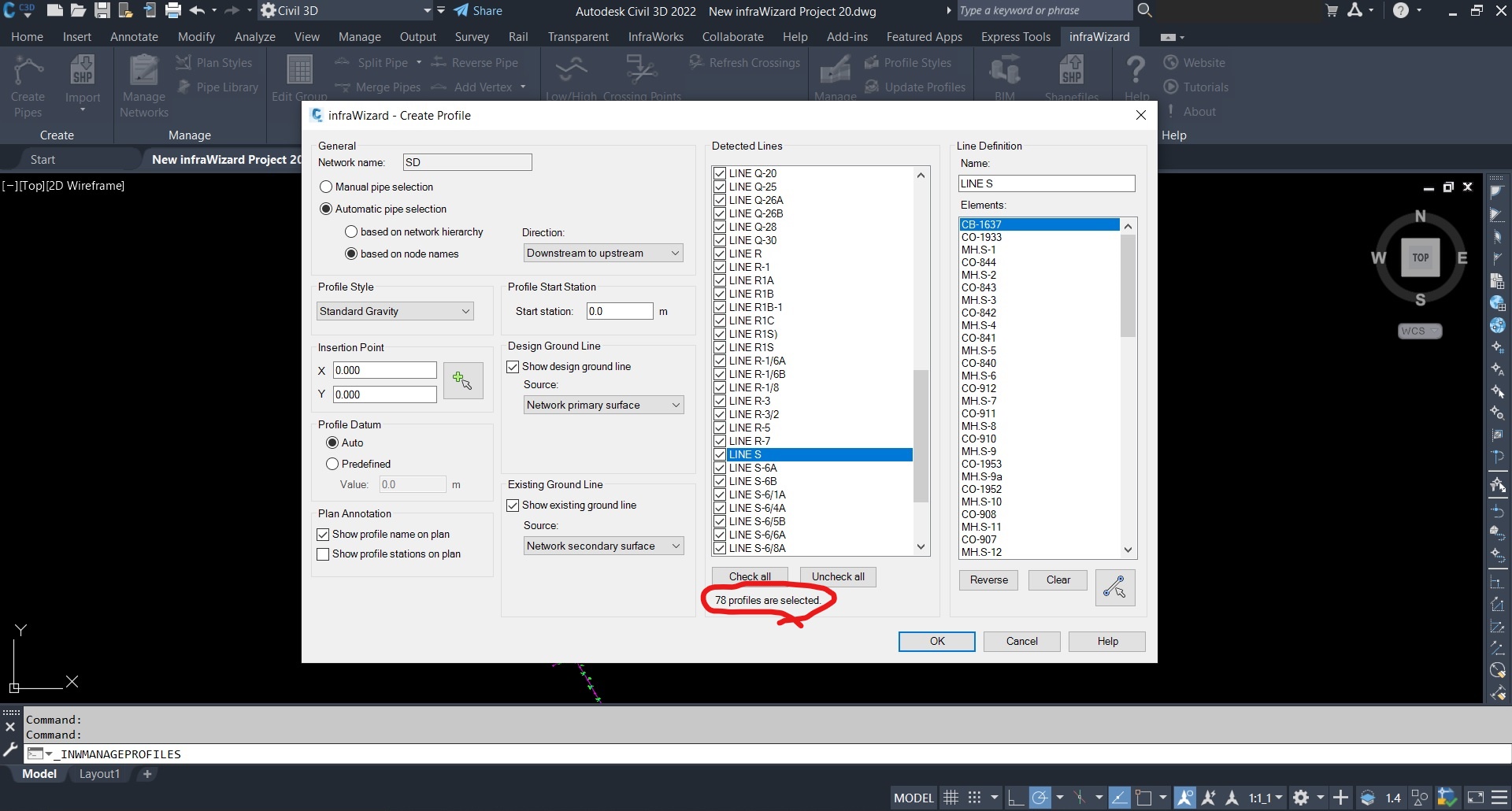 - Create well-formatted longitudinal profiles for pressure and gravity lines. You can use the auto-detect feature to create a batch of profiles that may contain hundreds of them in one go.