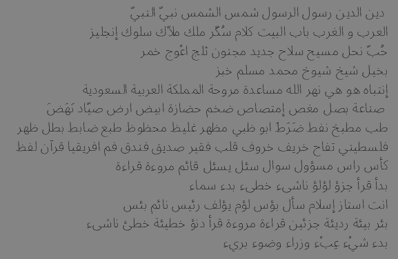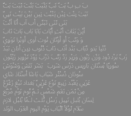 This Program uses all the characters from the Unicode “Arabic Presentation Forms B”, for the characters which go Right to Left. Numeric Characters (which go Left to Right) and Diacritical Marks (which are stationary) from the “Arabic” Code Block.