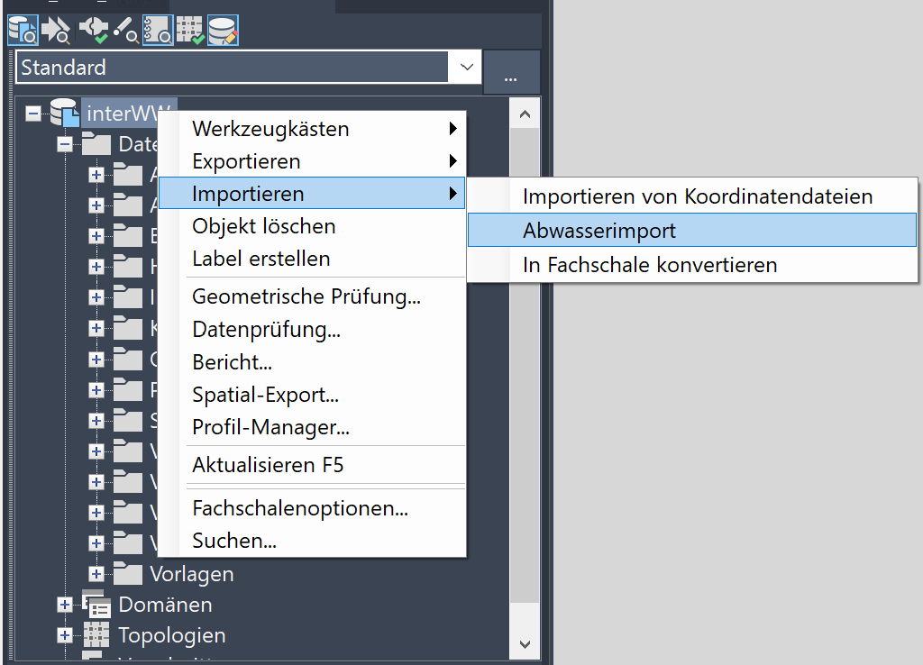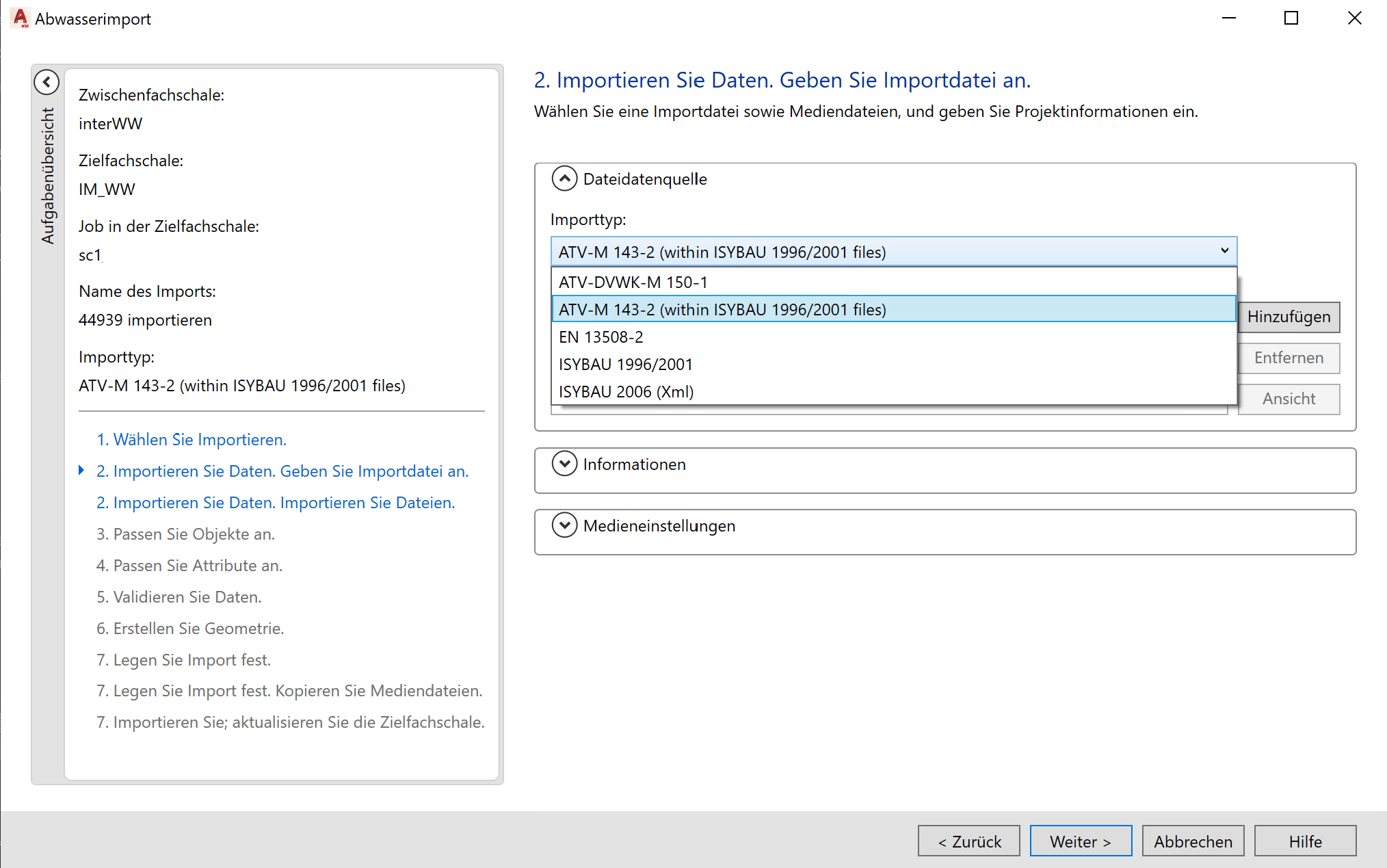 Supported file formats are: ISYBAU 1996/2001, ISYBAU 2006, ATV-M 143-2, ATV-DVWK-M 150-1, EN-13508-2