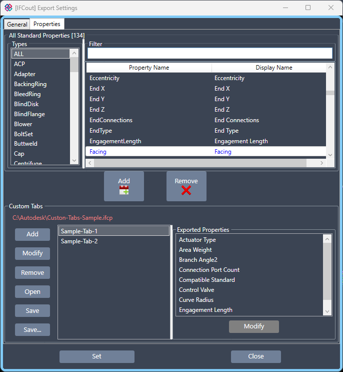 Properties (metadata) are exported with their display names and, optionally, organized into custom tabs for improved visibility in the importing application.