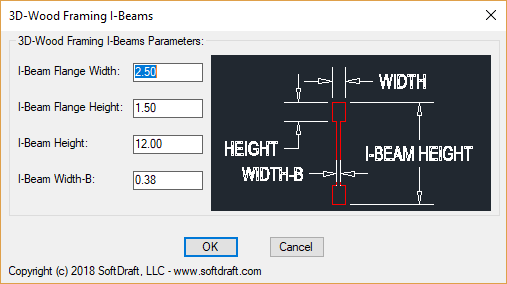 If you create Wood Framing Plans in 3D, then this app will save you a huge amount of time. Create a Wood Framing 3D model using a single line to represent the framing elements of the model. For Wood Floor I-Beam Joists use the bottom insertion point. Rafters can also be inserted using the bottom insertion points. Input the I-Beam dimensions, then click OK and select the lines to be framed. Each Wood shape is extruded along the line selected for a fast framing solution.