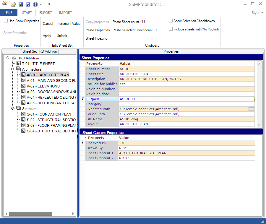 Edit properties on multiple sheets belonging to Autodesk® AutoCAD® Sheet Set Manager (SSM) or Autodesk® AutoCAD® Architecture Project Navigator (PN) Sheet Set View with ease. If you want to change properties such as a revision, date, or name on two or more sheets simultaneously, SSMPropEditor is for you. Your productivity will increase, and you will save time by eliminating a significant amount of manual work.