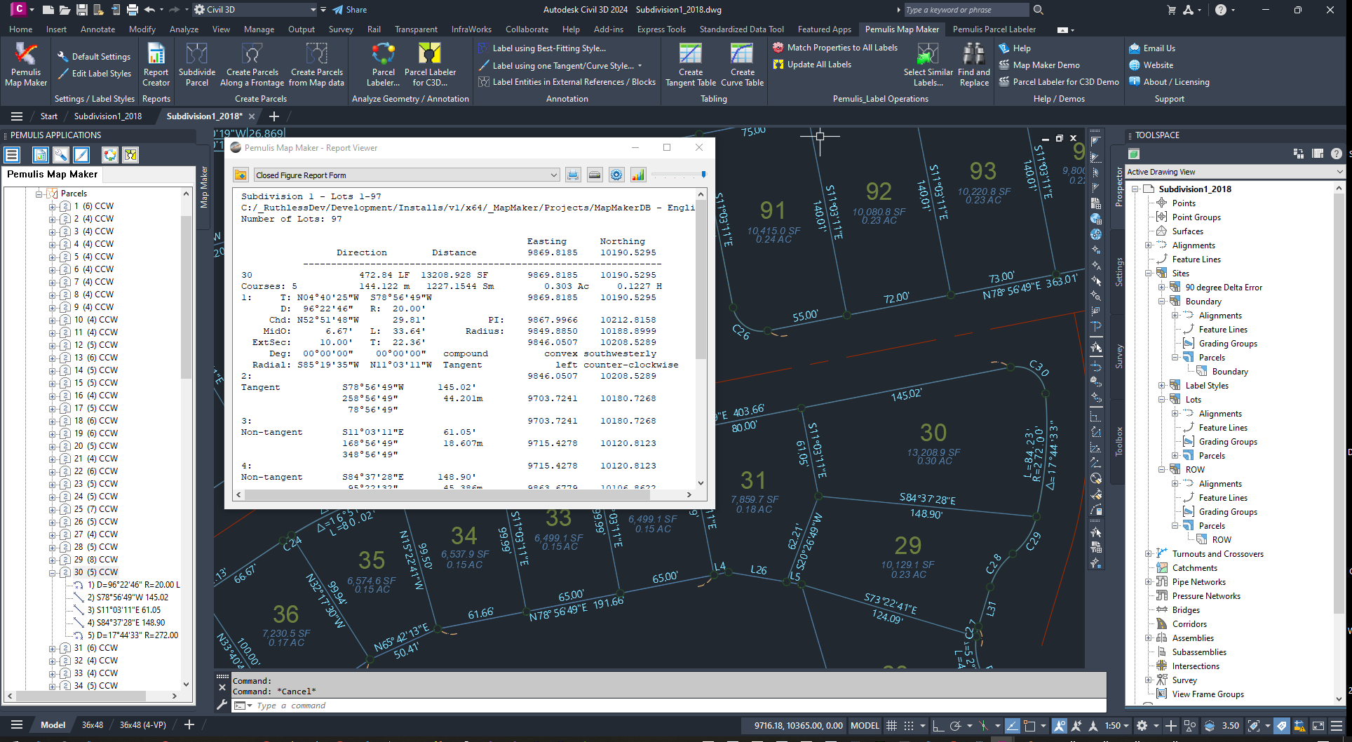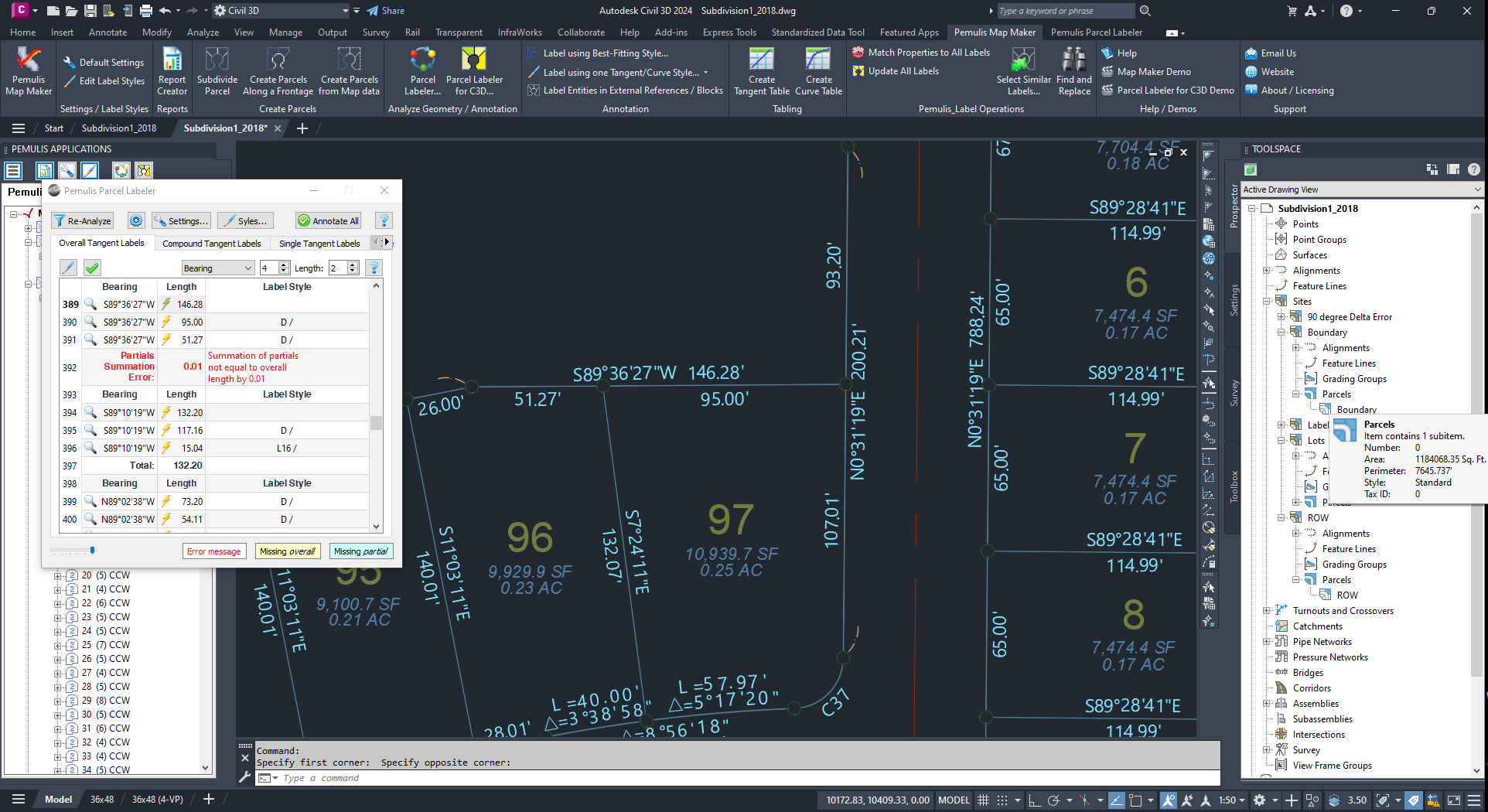 Find and fix geometry errors. For example, Pemulis Map Maker identifies where the sum of partial lengths doesn't add up to the overall length or identifies possible errors in the display of delta values in Civil 3D.