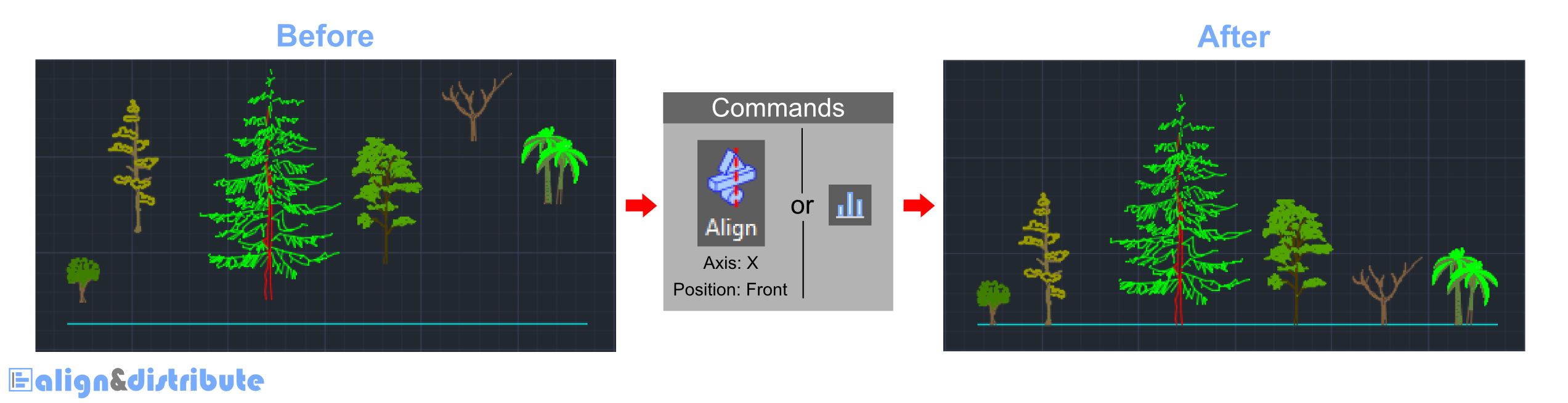 Autodesk® AutoCAD® provides a few commands (by default) capable of performing distribution and alignment functions. These commands are very complex, making the simple task of aligning and distributing something time-consuming and inefficient.
