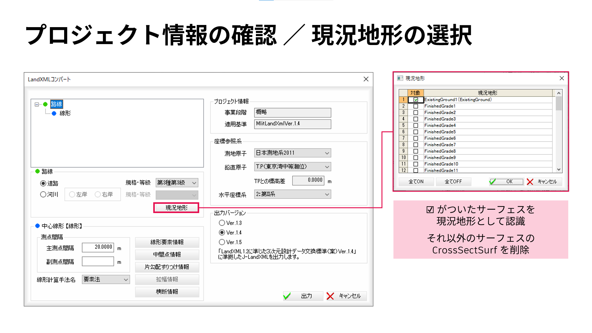 J-LandXML 出力に関しては、下記リンク中のマニュアル