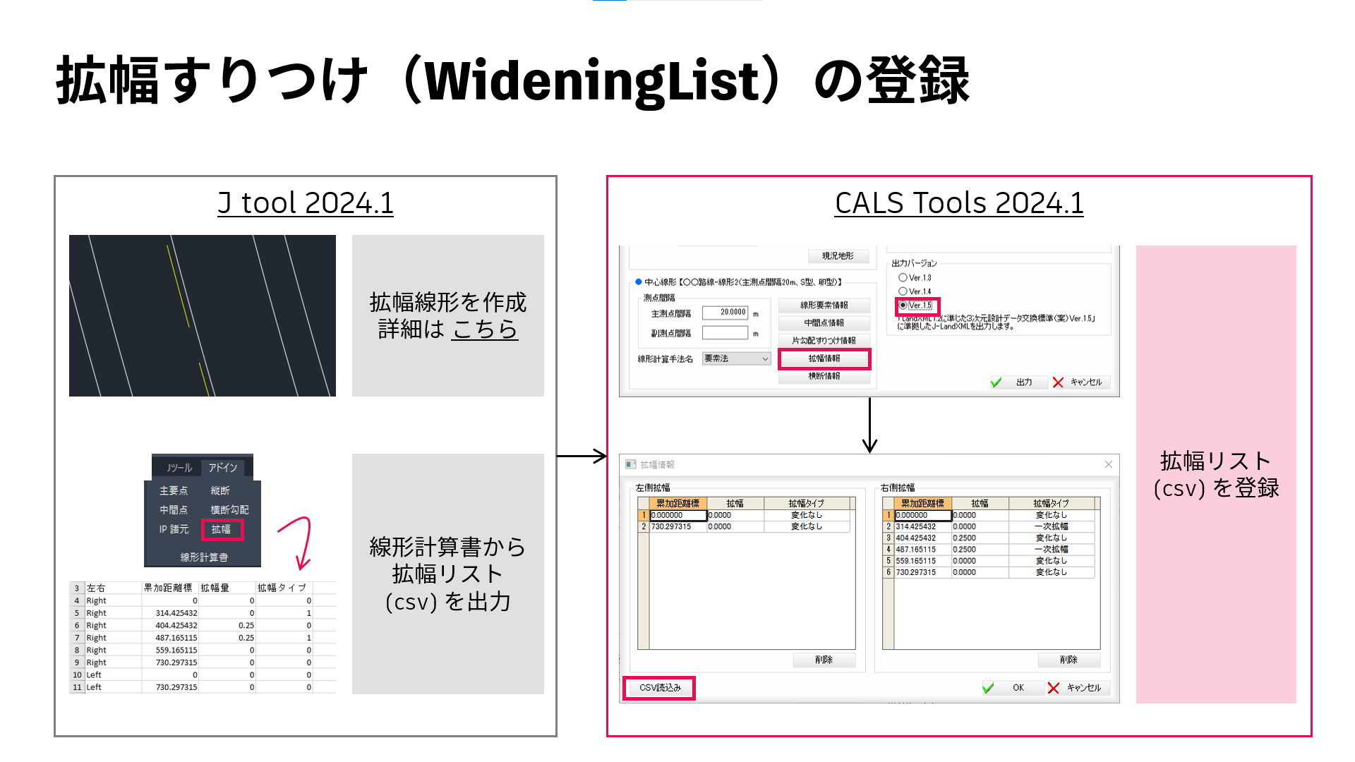 2023/04/04 Autodesk® CALS Tools 2024 リリース版 (23107) 2023/09/08 Autodesk® CALS Tools 2024 リリース版 (23141) 【23107 → 23141 変更点:J-LandXML】 ・Ver 1.3 or 1.4 に加え、Ver 1.5 での出力も選択可能になりました。 ・拡幅すりつけ(WideningList)の情報の登録が可能になりました。 ・現況地形を選択し、現況地形以外は CrossSectSurf を削除することが可能になりました。 ・線形が無いデータ(サーフェスのみのデータ)の読込も可能になりました。 ・プロジェクト情報や座標参照系の確認が可能になりました。 |