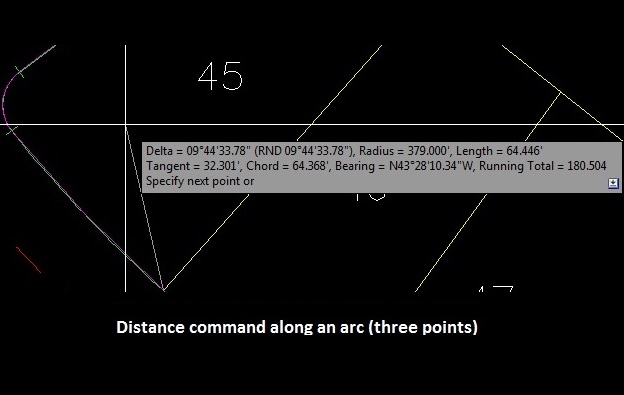 Distance: A tool to measure the distance and angle between two points or measure the length, delta, radius, tangent, chord, and a chord bearing along an arc. The elevation of the selected points is ignored.