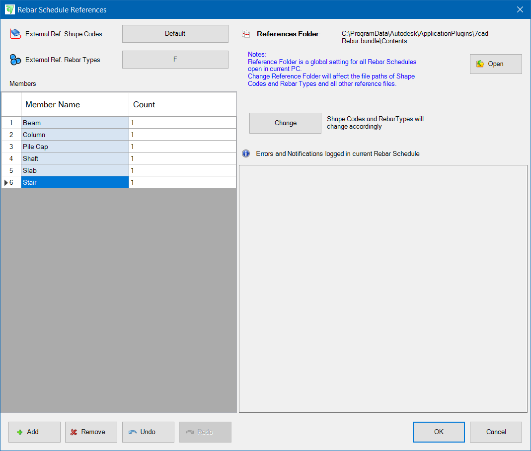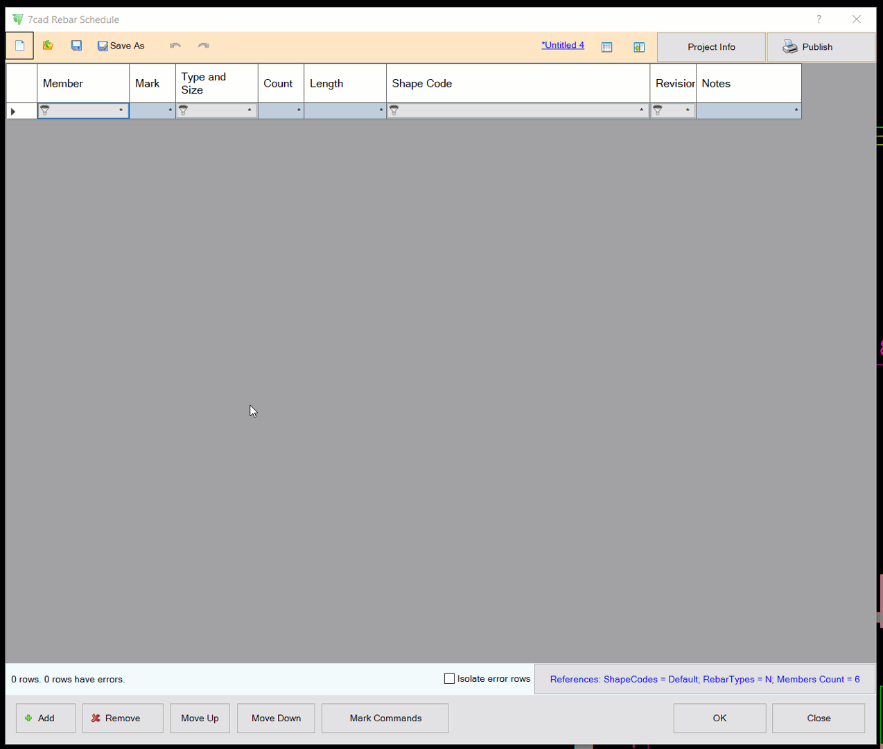 This command brings up the 7cad Rebar Schedule window. Every rebar schedule can be saved to an external rebar schedule file. From the top menu, you can feel at home with the New, Open, Save, SaveAs, and Undo/Redo buttons to work with the rebar schedule file.
