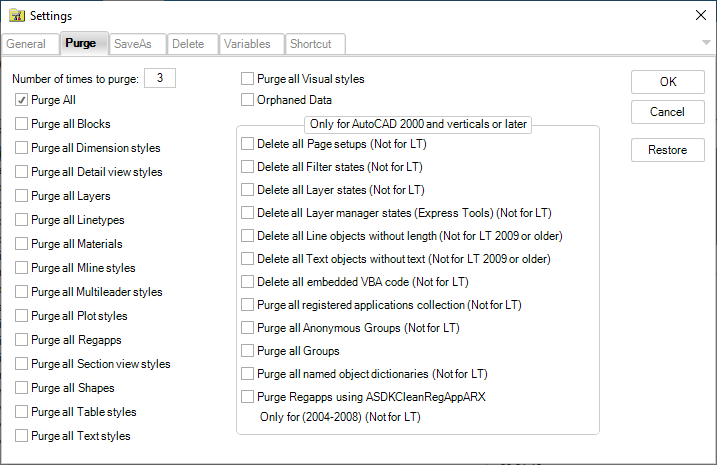 You can run the audit, zoom extents, and create preview icons. Convert between versions. Purge Blocks, Dimension styles, Layers, Linetypes, Mline styles, Shapes, Text styles, Plot styles, Page Setups, Filter states, Layer states, Layer manager states (Express Tools), Line objects without length, Text objects without text, embedded VBA code, registered applications collections, Anonymous Groups, Groups, Orphaned Data. It's possible to restore the date and time of the file to what it was before the scripting. Delete.BAK and other temporary or garbage files and much more. Remember that this is a very powerful tool and make sure you understand and know what you do when you use it. Read the documentation before you run it. Try on some test files/folders as a start. To be on the safe side make sure you have backups before you run.