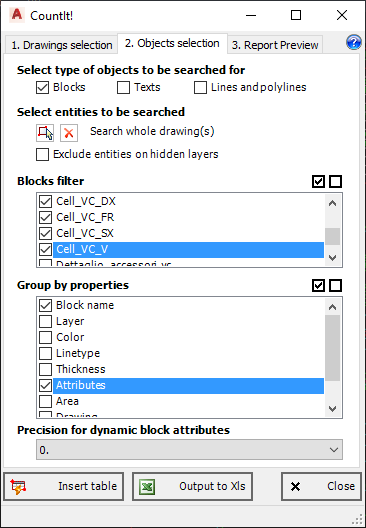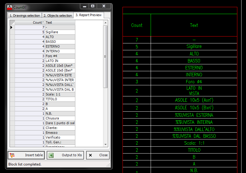 When you are satisfied with your selection you can both insert a table on a drawing or export the results as an XLS workbook, even without MS Excel installed.