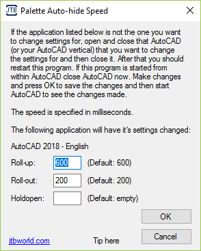 With this app, you will be able to change the time it takes to show/hide or roll up/roll out the palette windows in Autodesk® AutoCAD®.