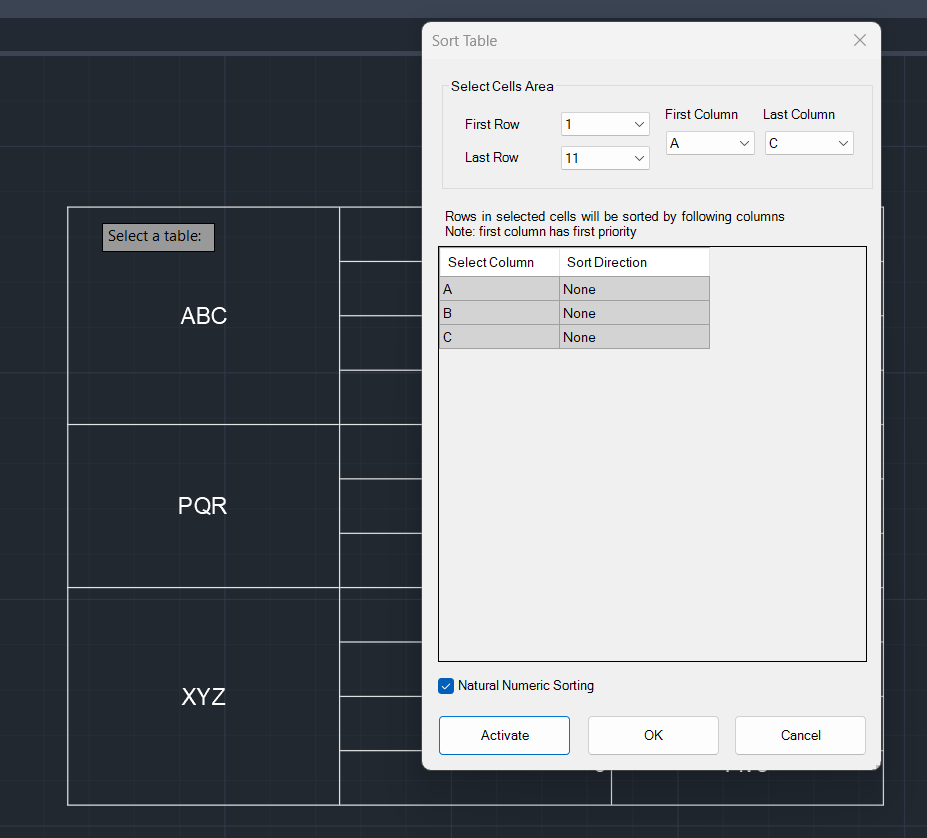 Just as easy as in Excel, you select a table or cells (in AutoCAD), run the SORTTABLE command, or start it from the Add-ins or Plug-ins ribbon tab in AutoCAD, then select columns to sort them.