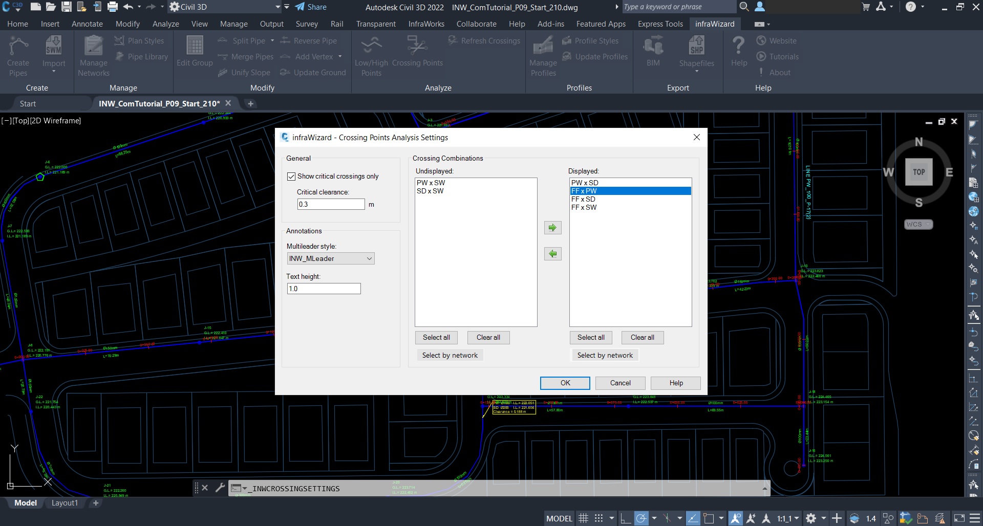 - Get instant crossing points to check between pipes and see crossing annotations on the plan indicating vertical clearance. You can control which crossing annotations to display by selecting network combinations and defining the critical clearance value.