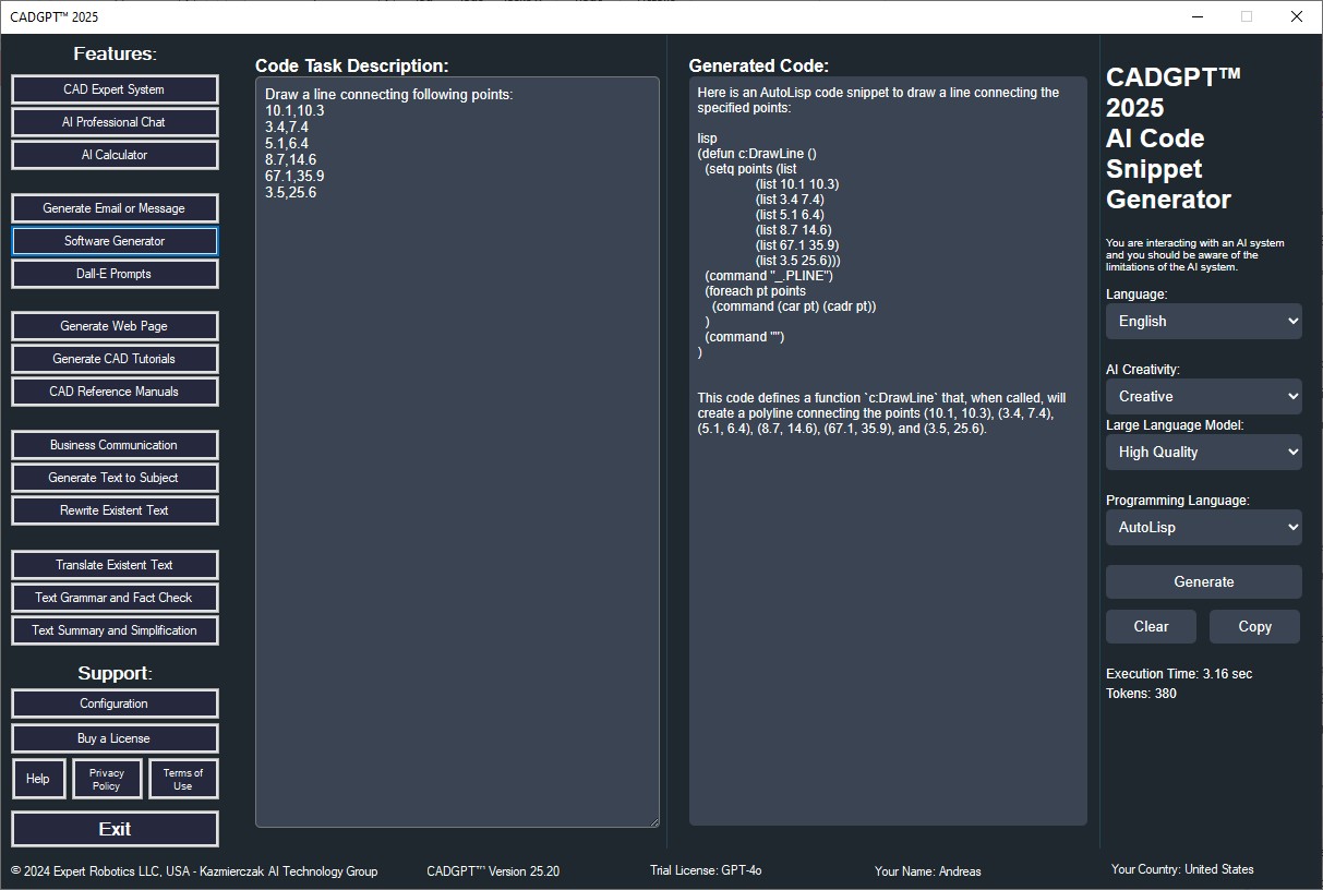 In expert mode, you can generate Visual Basic, ObjectARX, or LISP code, or ask highly specific questions.