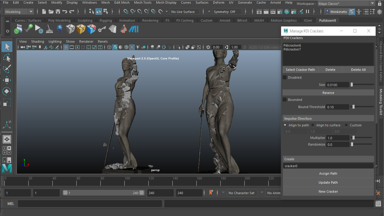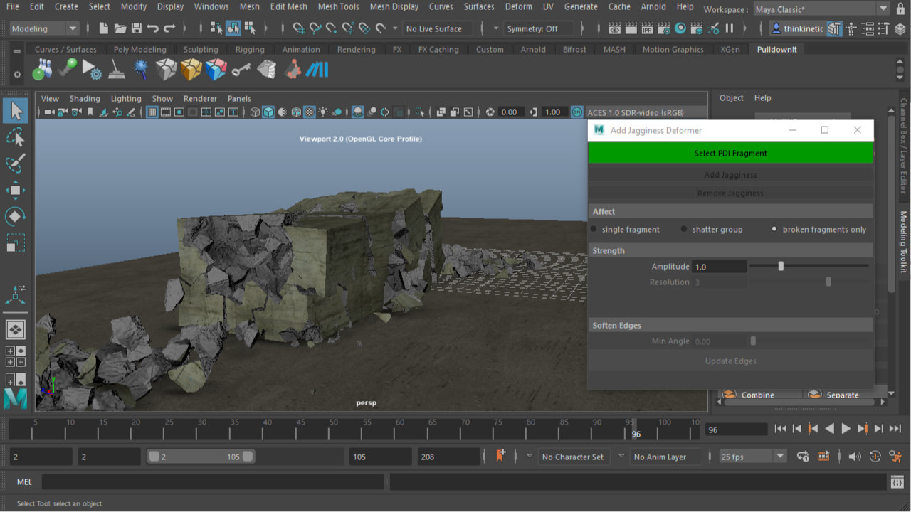 Pulldownit is a dynamics plugin intended for destruction effects as well as massive rigid bodies simulations. By using it, digital artists are able to shatter objects in different styles, create surface cracks and easily animate the fracture of 3D models. The power of Pulldownit solver allows computing thousands of objects in dynamics in a stable and realistic way.
