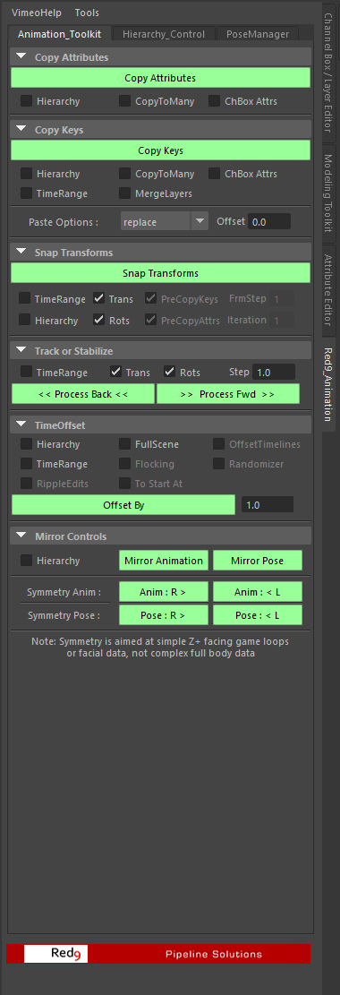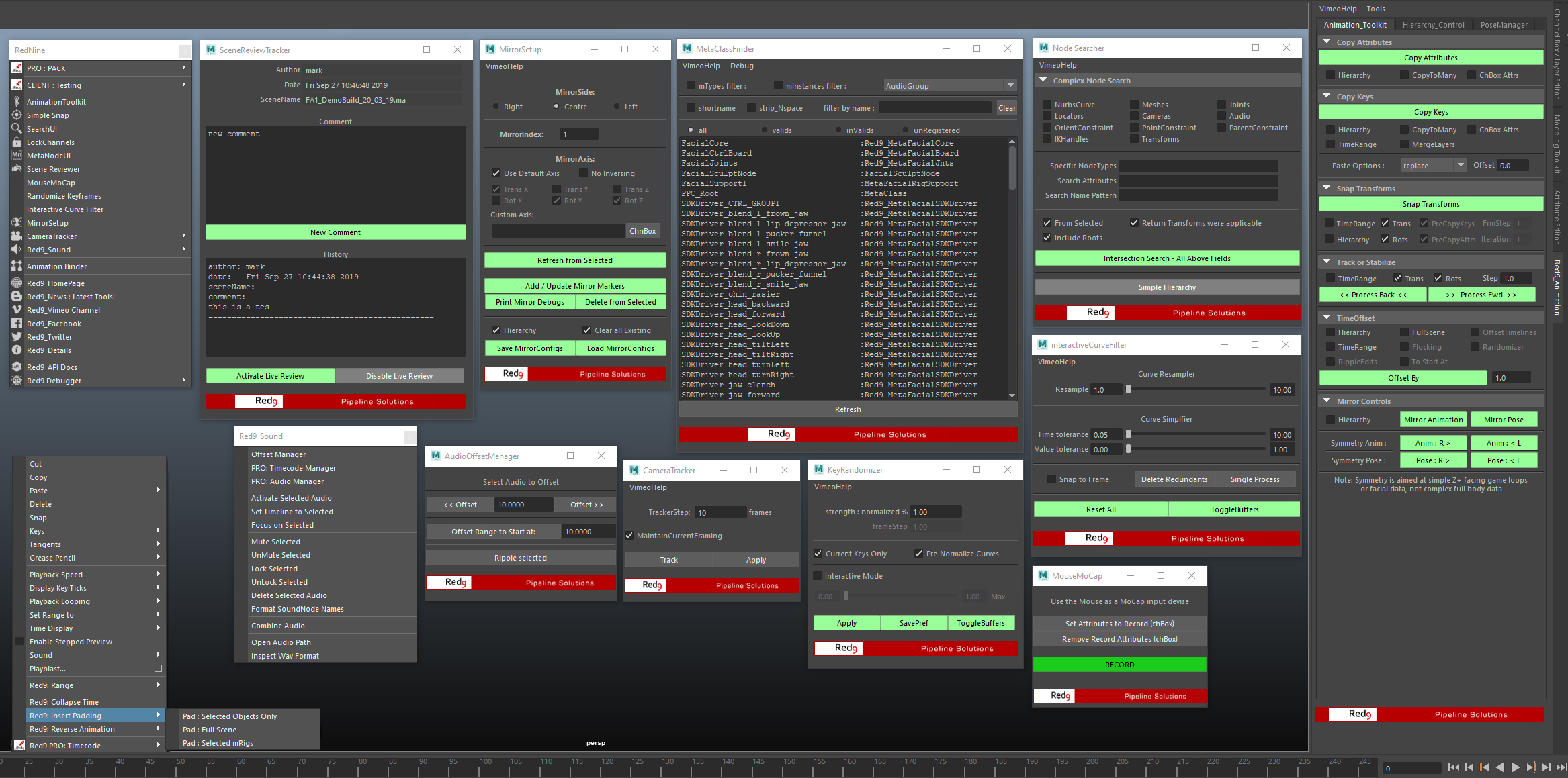 Red9 StudioTools were born out of frustration, based on years of production experience building pipelines and toolsets around a modern animation workflow. It's aimed at those studios & individuals looking for a professional and integrated solution for dealing with complex rigs/setups but without the benefit of an R&D department to write bespoke solutions.