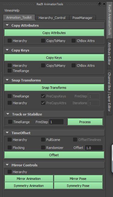 Red9 StudioTools were born out of frustration, based on years of production experience building pipelines and toolsets around a modern animation workflow. It's aimed at those studios & individuals looking for a professional and integrated solution for dealing with complex rigs/setups but without the benefit of an R&D department to write bespoke solutions.
