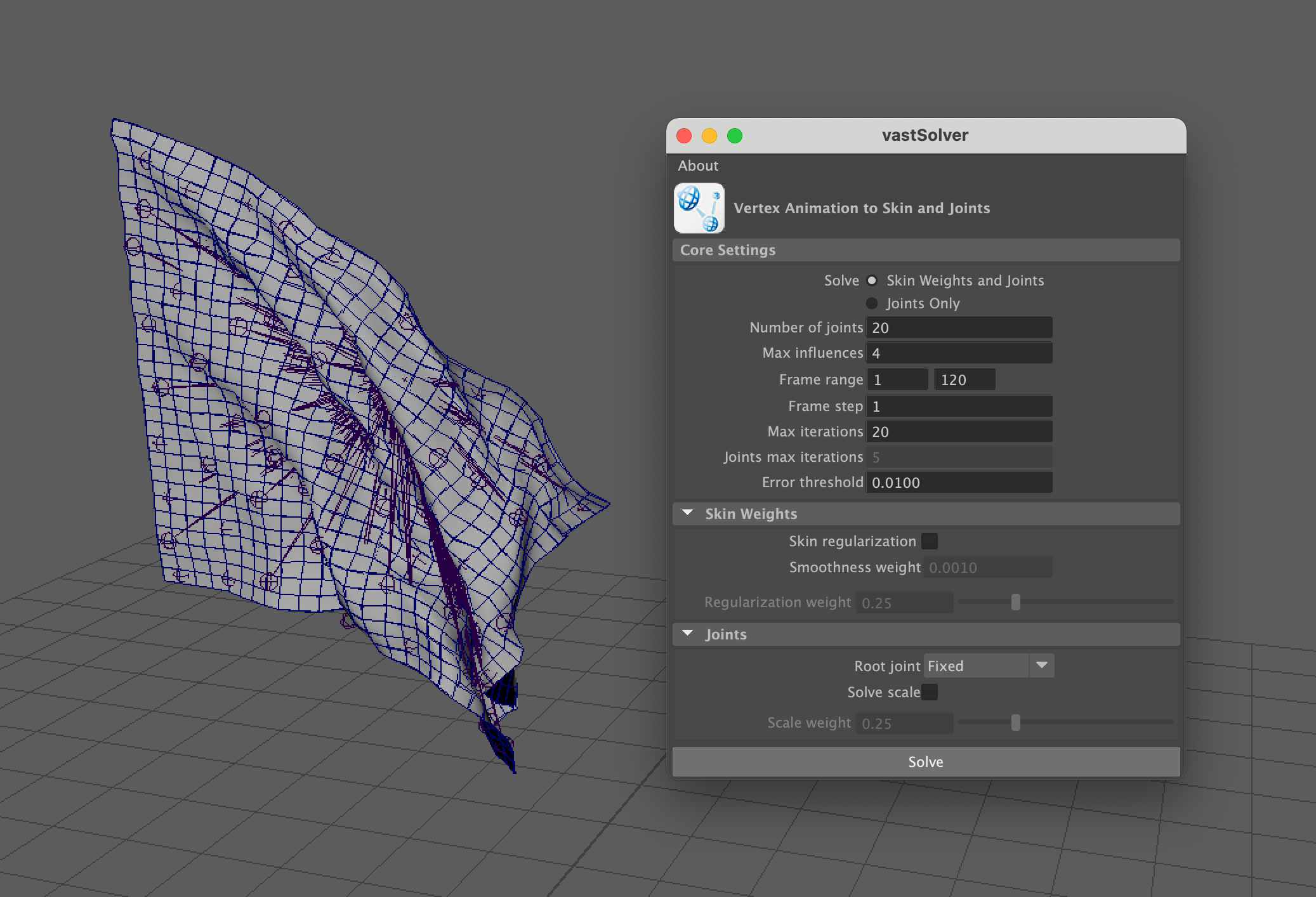 The vastSolver is an Autodesk® Maya® plugin that lets you convert any vertex animation into a skin weights and joints animation. The main use is to compress mesh animations, such as a blendshape-driven animation or a cloth/muscle simulation, for use in the game engines.