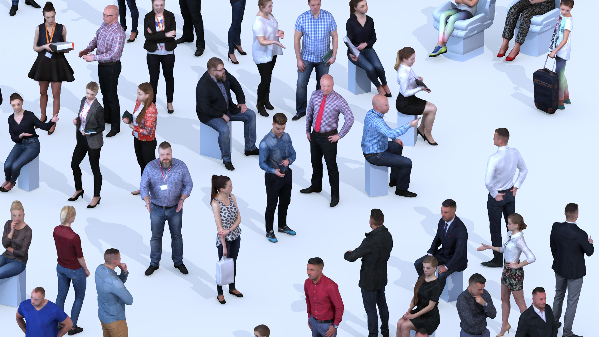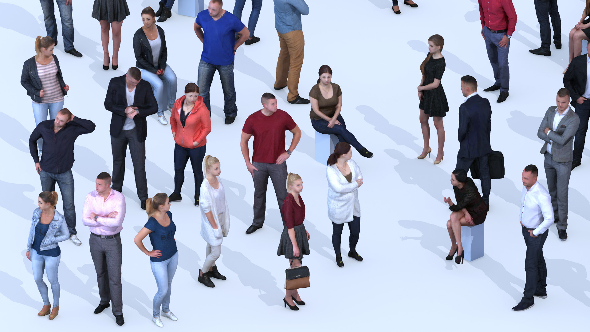 The product DOSCH 3D: Lo-Poly People Vol. 3 contains 100 fully textured lo-poly 3D-models (10,000 polygons per 3D-model) of photo-real people in various poses.