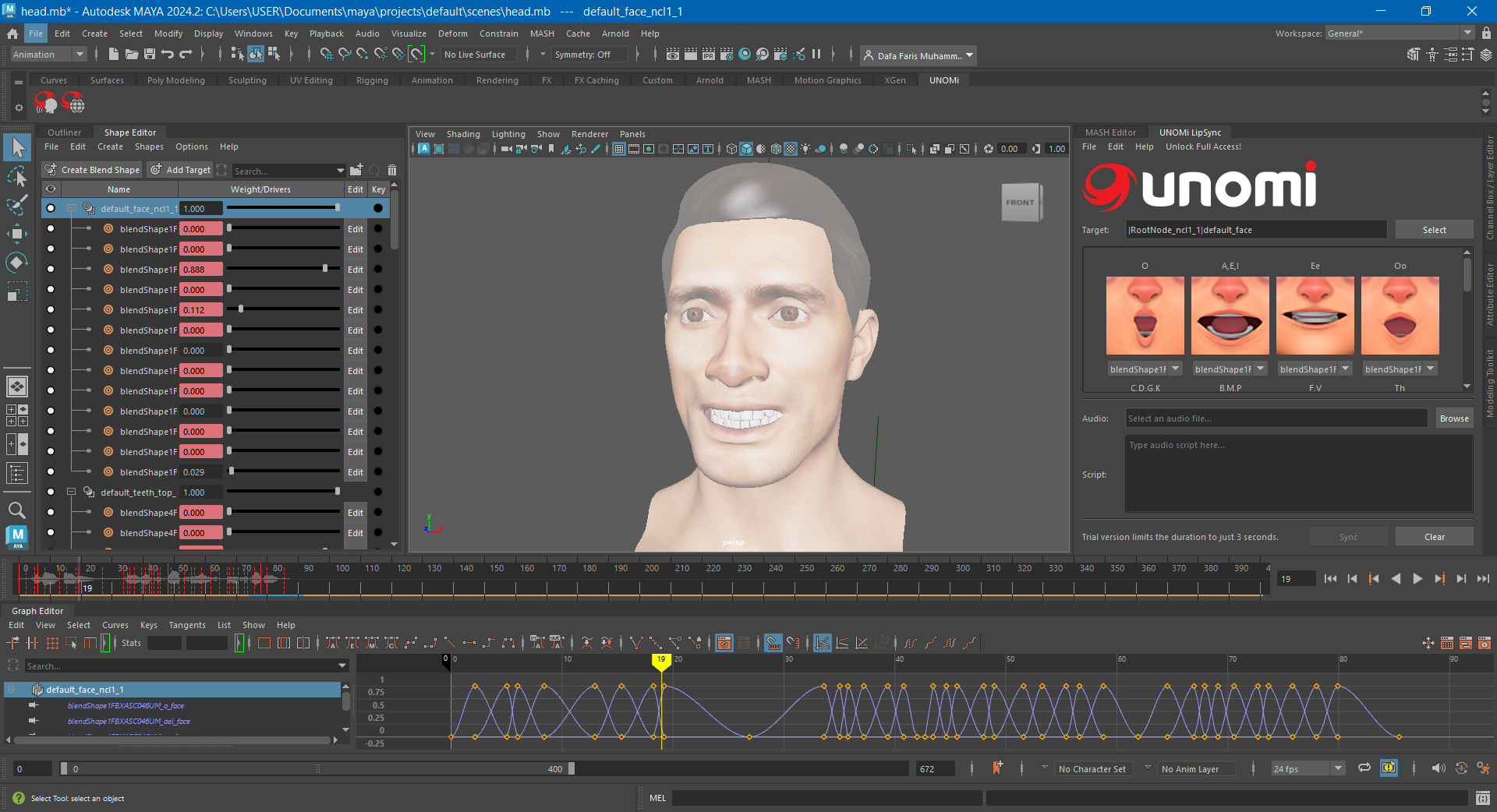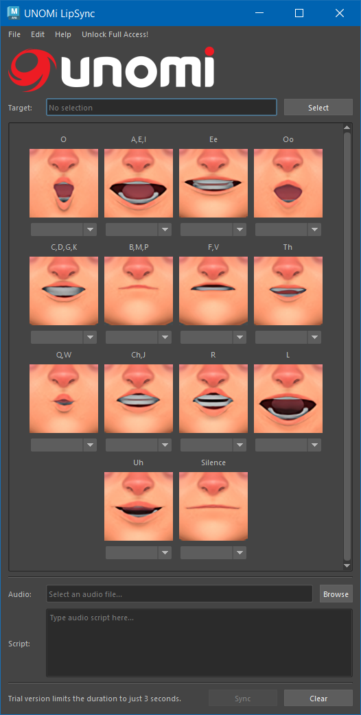 The trial version is limited to just a few seconds of lip-syncing duration. Register to buy the full version for unlimited access at: https://getunomi.com/