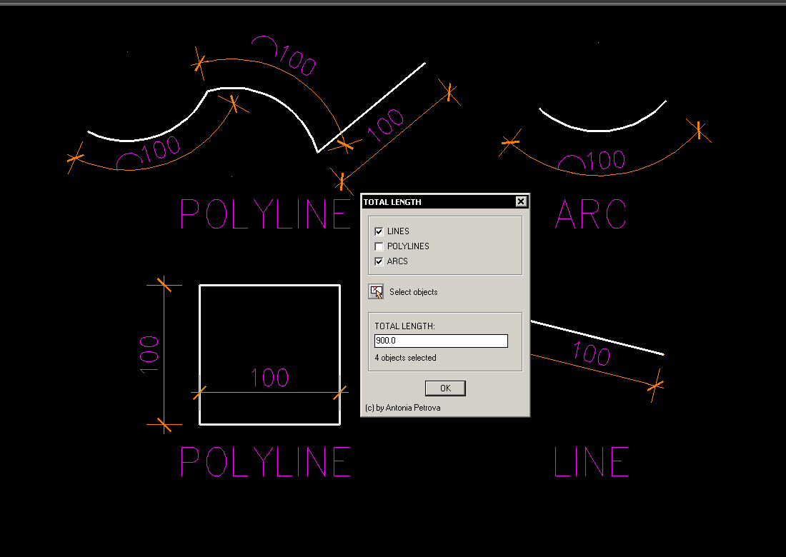 TotalLength is an Auto Lisp script calculating the total length of multiple objects of user-selected type(s) - lines, arcs, polylines, circles or combinations of them.