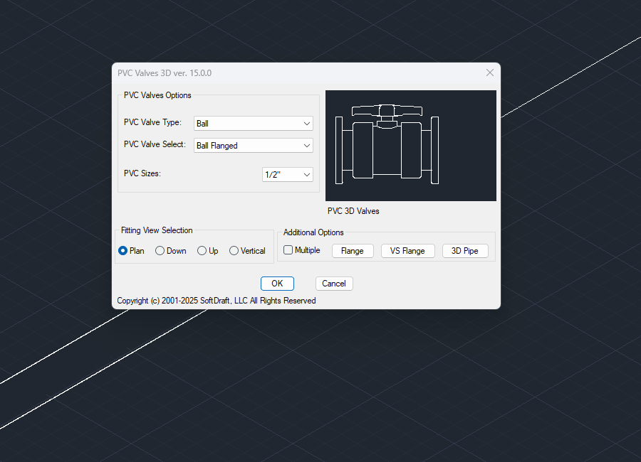 PVC Valves 3D allows the user, without having to change the UCS to easily place valves in various 3D views by selecting one of the toggles on the dialog. Valves are inserted with the valve handles on the side, top, or bottom of the valve body or in a vertical position based on the toggle selected. The 3D pipe can also be easily drawn to the size selected.