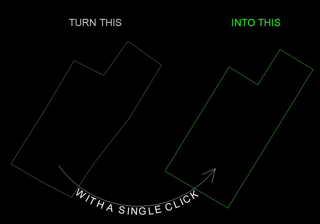 This app will square off Autodesk® AutoCAD® polyline entities and remove redundant vertices along individual edges. Such polylines usually originate from field survey data due to random errors/imperfections in the measurements. The app will generate new entities, the original polyline objects are not modified and are available for comparison with the end result. Adjustment parameters such as Angle and Dist tolerances provide user control over how aggressive the "repair" process should be.