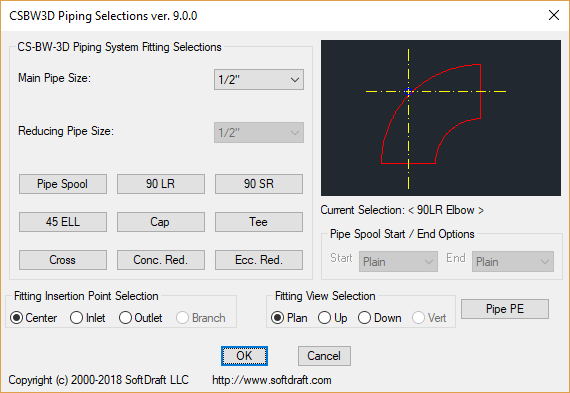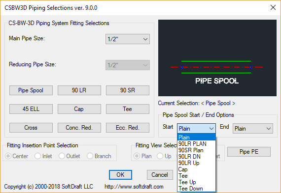 The unique Pipe Spool Feature allows you to draw a pipe spool with two selection points and a specific start and end fittings. Start and end fittings include, Plain End, Break, Stub-In, 90 Down, 90 Up, Cap, Tee Plan, Tee Turned Up, Tee Turned Down.
