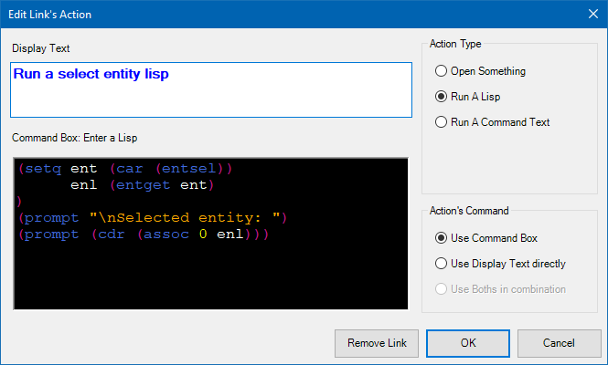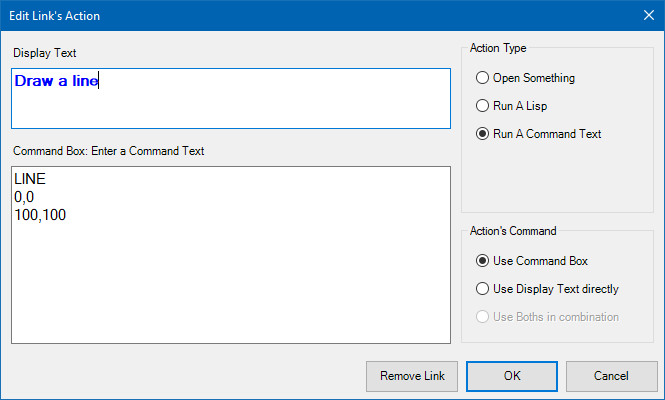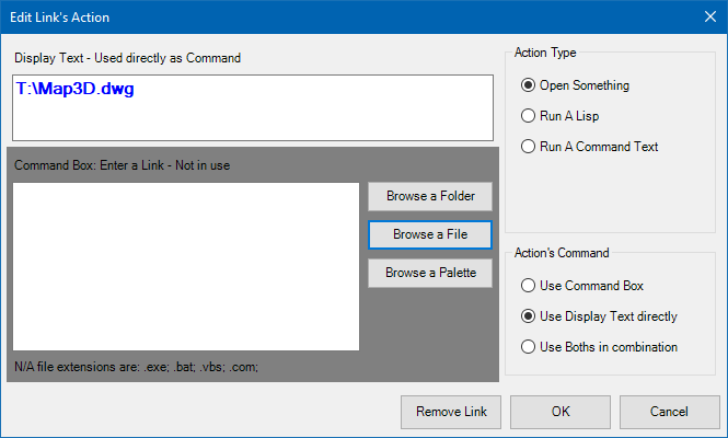 2. Link Text Cell: This is the featured cell for writing notes with hyperlinks. The hyperlink can perform many types of actions: open a file, open a folder, open a website, run an AutoLisp code, or run an AutoCAD script.