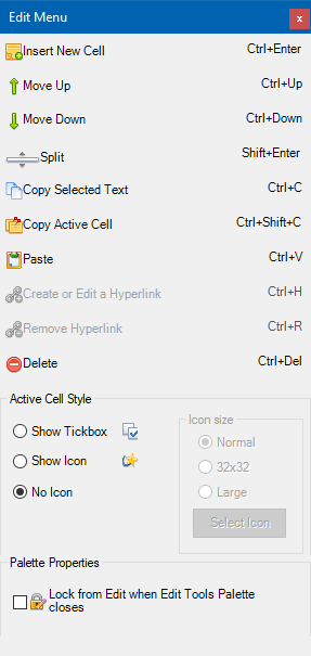 7cad Instructive Palette provides many handy tools to edit the LPalette document. Right-click to the palette, or click the Edit Menu button for the Edit Menu to show up. Then, you can see tool to insert a new cell, a tool to split an existing cell into two, tools to move a cell up and down, etc. Optionally, a cell can also have a tickbox or can be decorated with an icon.