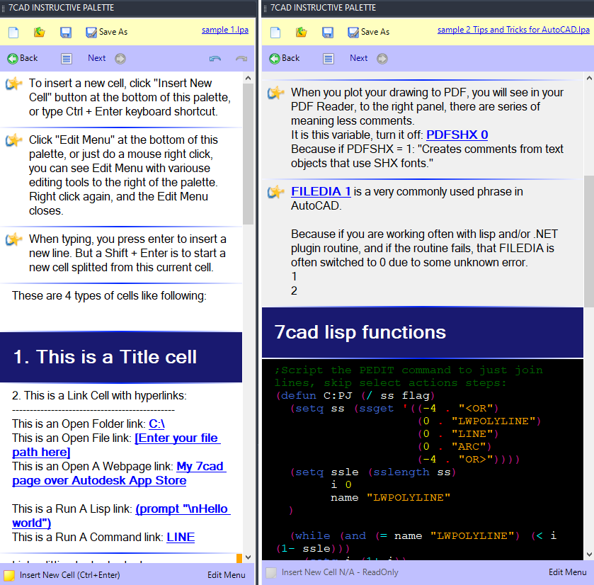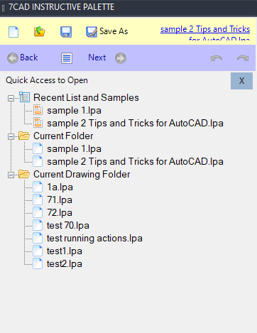 The 7cad Palette is an editor for you to write an instructive document for Autodesk® AutoCAD®. You can save the content to a file with a ".lpa" extension, called LPalette document.