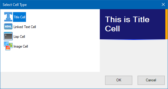 4. Image Cell: Copy an image to the clipboard, then you can run Paste (Ctrl+P) the image to this cell. It allows only small images. If the pasted image is too large, it will be resized.