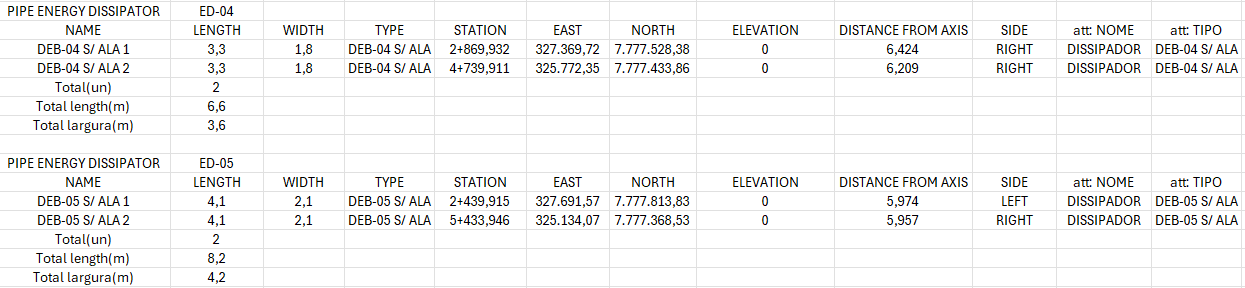 - Polylines with global width: numbered name, length, width, start station, start east, start north, start elevation, start side, end station, end east, end north, end elevation, end side.