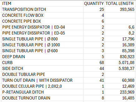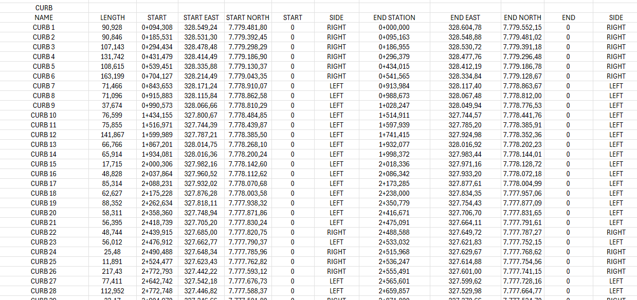 - Polylines: numbered name (ordered by polyline or Civil 3D alignment direction), length, start station, start east, start north, start elevation, start side (relative to the axis), end station, end east, end north, end elevation, end side.