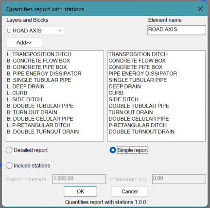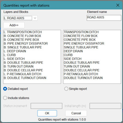 At the top-right of the dialog box, a list displays polyline layers (prefix L:) and block names (prefix B:). Select the polyline layers and block names you want to quantify, edit the Element name (optional), and click the Add>> button to add them to the list below. The layers and blocks you add to the list will be quantified. Next, choose whether you want a Detailed or Simple report.