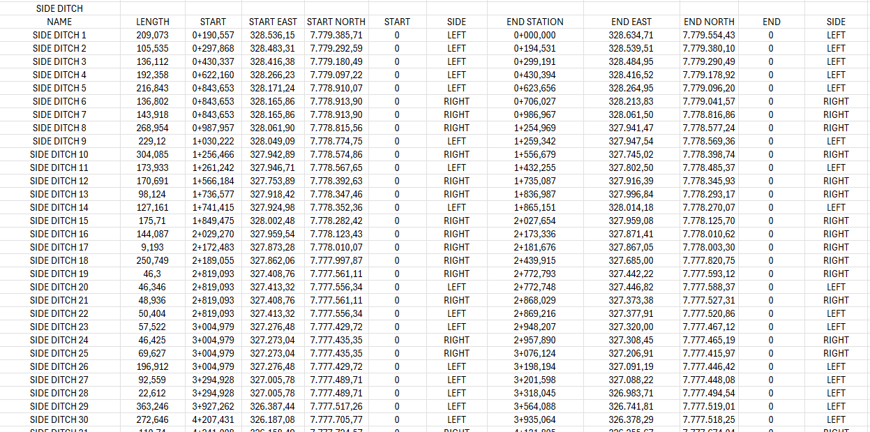 - 3D Polylines: numbered name, 2D length, 3D length, start station, start east, start north, start elevation, start side, end station, end east, end north, end elevation, end side.