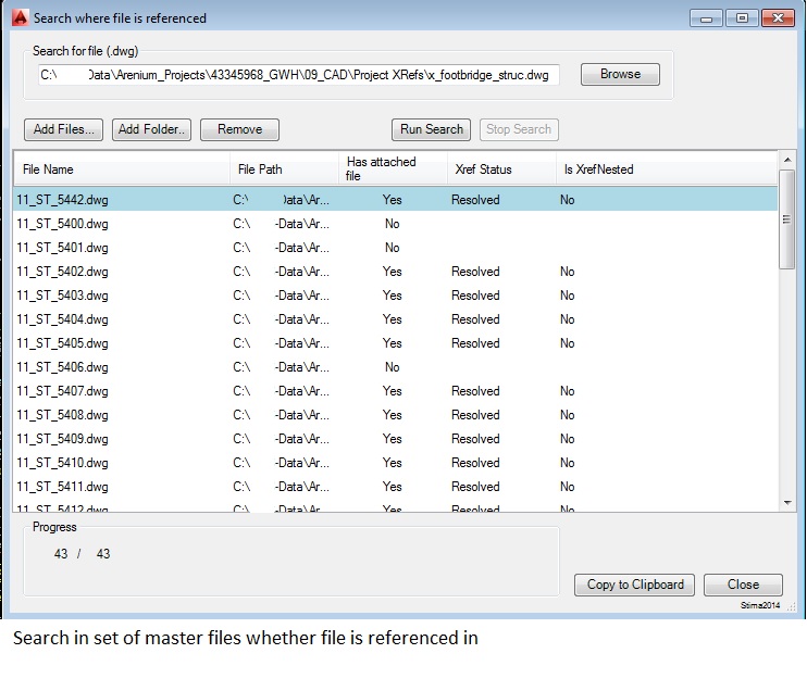 Run search in list of master drawings and indicate whether chosen file is referenced into the master drawing.