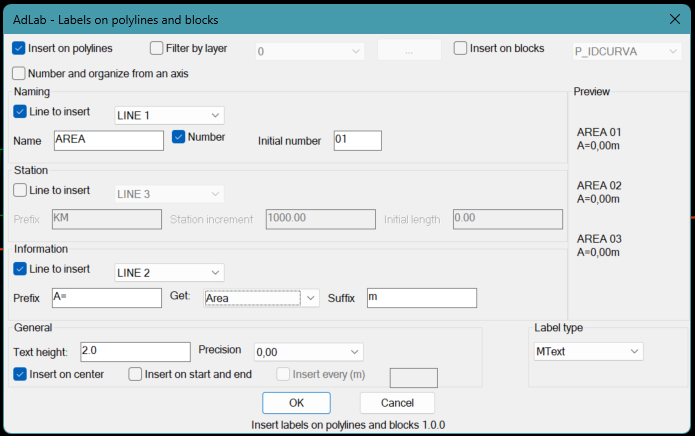 This app allows you to insert multileader or MText labels on polylines and blocks. In an interactive dialog box, you can customize these multileaders or texts to display information according to your preferences.