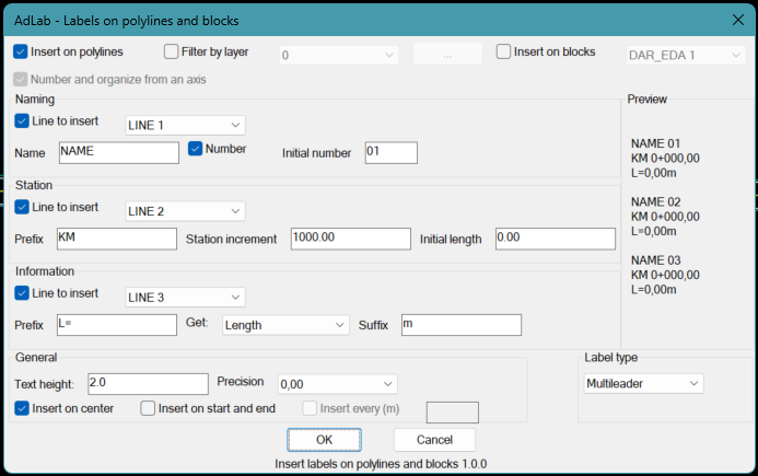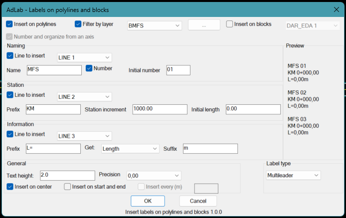 The inserted multileader or text can contain up to 3 lines, displaying information such as numbered names, stations, lengths, areas, dynamic properties, and more. Once you have customized the dialog box, the multileaders or texts will be inserted into all selected objects.